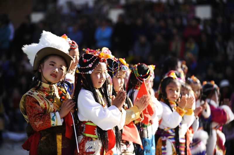 一、生活习俗 (一)服饰。木里藏族服饰丰富多彩,美观大方,并随地区的不同略有差异。但大多喜欢色彩鲜艳的服装,尤喜白、大红、蔚蓝、粉红、桃红、桔黄等颜色的衬衫。 男子服饰? 男子留长发并编成若干小辫,下端合并成一根粗辫,用象牙或牛骨圈子套上,拖于脑后,称“纳饶”。也有不留长发而剃成光头的。较富者戴用盒丝锻、金丝带和银丝缎做装饰,以皮毛作料,并有图案的“次仁夏木”(金边帽)。有的则戴“甲哈狐窝”(博士呢帽)、狐皮藏帽。贫者戴金狗皮帽或野猫皮帽,也有打光头的。男子上装穿短衫,以白色布或绸料为多,多数高领,袖子长,右边开襟扣纽绊,并用金银丝布滚衣边。外罩圆领宽袖“曲巴”(或称“曲沃”),“曲巴”以棉布、麻布、毛布、皮板、绸缎为主要原料,左襟大、右襟小,一般在右腋下钉一个纽扣,有的用红、绿、蓝、血青等色布做两条宽4公分,长20公分的飘带,穿时结上,就不用扣子了,男藏袍底边多加装饰,缀以氆氇、豹皮、虎皮、水獭皮等。穿藏袍时,将衣领顶在头上,把腰部提起,腰间系上红色毛布带子(僧人系黄色腰带),一般夏天或劳动时穿左袖,右臂袒露,右袖拖在背后或搭在右肩上;也可左右袖均不穿,两袖柬在腰间。但冬天一般两袖均穿上。男子藏袍的前摆要求平直,后摆讲究折纹。至于前摆在什么位置,还有等级之分。有钱有势的贵族,有高深文化教养的人,他们的下摆一般长过膝盖,而一些贵族的护兵,表示骁勇力壮的人,他们的下摆在膝盖之上,收得较短;-般的人,他们的下摆与膝盖平。腰际右侧缀挂一把吊刀(银制或铜制刀鞘),上面雕有龙、花、动物等图案。富有的男子腰间还柬一条缀以30颗银花并用4根银链串连的银钱包。左肩背挂金制或银制“嗄宝”(佛像盒)。男子下装宽肥。脚穿“支康宝”、“甲秧”或“秧”。“支康宝”靴做工精巧考究,喜庆节日才穿用。靴底用牛皮制作,用皮线密密缝钉,厚达寸余;靴帮色彩斑谰,分别用红、黄、绿、蓝等多种颜色的丝线绣花边和花瓣,并用黑氆氇呢做靴腰,长腰与靴面间,用红绿毛呢相接,靴腰上端靠腿肚部位,剪开一条约十公分的口子,便于穿着和提携。穿靴时,将裤肿扎入靴口一同用精制靴带在膝关节下方扎紧。解放前,“支康宝”靴富贵人家才有。民间较为普遍的是“甲秧”靴,也是以牛皮作底,靴底钉鞋钉;靴帮用三层氆氇粘制或用马鹿或麂皮缝制而成,后帮开五寸剪口,口边分别用染红羊皮加固,便于提携,靴后跟和靴尖缝上黑色牛皮,靴面用染黑牛皮拉条及金丝镶边,使之美观。“甲秧”鞋的特点是鞋尖朝上耸起,宛如本船的前端(狗鼻),穿上威武大方。“秧”靴属一般的鞋。靴底以牛皮包起来缝制而成,底层步,靴帮用牛皮或毛布,不加装饰,轻便,适宜于天气暖和的季节穿。 女子服饰? 木里藏族妇女有的地方留长发,加青、红头绳编成两条长辫盘于头顶。在发辫上插上宝石、珊瑚、琉璃珠或密蜡石等饰物的“巴珠”。水洛、东朗、麦日等地部分藏族妇女和未婚女子头发则编成百根小发辫,每根小辫之间用线连成网状的两块,覆盖于头顶左右两侧,披于脑后。头顶中部两侧各挂一个较大的黄色“比石”(密蜡珠),前额两侧各吊一颗较大的咀银皮包着的绿松石珠子,两鬓拖有两根小发辫,辫端各挂一十银制“纳采”(耳环),脖子上戴镶有三颗较大的金或银花的“轿巴嗄””(项链)和各色珠子串成的较短的“八嗄”以及数串长短不一的“冲旺”(珠子),朐前挂一个银翻的精巧圆形或莲花瓣型的“嗄乌”(佛像盒)。双手带象牙或银制手镯和嵌有绿松石的铱制戒指。 藏族女子服装随不同季节和不同地区而有所区别。有“纳竹”,“盖礼”(无袖藏袍)、“夺显”、“空”(长裙和衬衫等)。女子上装穿短衫,用印花绸布作衬衫,右边开襟扣纽畔并用金银丝布滚衣边。穿“盖扎”时,里穿衬衫多翻领,袖子砖,长出部份平时卷起,跳舞时放下,以增姿色。女子藏袍“夺显”,制作讲究,用紫色毛布、卡叽布或黑色、青色布料为主要原料,高领、宽大。领子和袖子滚有红、黑、绿、紫等布边。下摆滚有5寸左右的滚边;后腰多绉褶,后背系腰带处缝有三根不同颜色的横条。后肩至两袖臂膀处用三寸宽的红绸布作底。再以黄、白、黑、绿、蓝绸料制作成三角形状重叠压缝,以色布滚边。似一条彩虹横挂臂肩处,肩至中袖处接宽约4寸左右的红或蓝色绸布绕一圈,下摆到脚背。腰束红色毛布带子,佩挂用银制的桃形圆盘,连接成三角形坠子,下吊银串铃(卡壶八壶),用银链悬挂于右腿到膝盖部位。或以3寸宽、2尺长的麻布作垫层再加红布镶面,嵌十多颗螺片竖挂前腿右侧。腰部带子上加系两块较大的方形多图案银质的“恰典”或在五寸宽的布带上嵌有30多颗白海螺片的“古热”,腰酥右侧挂一把精制小刀,脚穿“支康宝”(藏靴)。 “盖礼”以绸布作料,后腰无绉褶,左襟大,右襟小,长到脚背,色彩鲜艳,腰束红、血青、绿色等绸缎或平布的腰带,适宜夏秋穿。 “空”为女式有袖藏袍,类似“夺显”,只是下摆无龟布装饰,滚以红色布压边。一般以青、黑、绿等布作料,制作不如“夺显”考究。 女子无论穿何种类型的长袍,均在腰前系一块图案美丽、颜色鲜艳、用氆氇制成的“帮艘”(围裙)。 有的她方妇女下着白色褶长裙,裙长及地,用棉布或麻布制成。上着红灯蕊绒或白布作料,衣领滚有金、银丝布边的衬衫。衣裙相连处柬红色