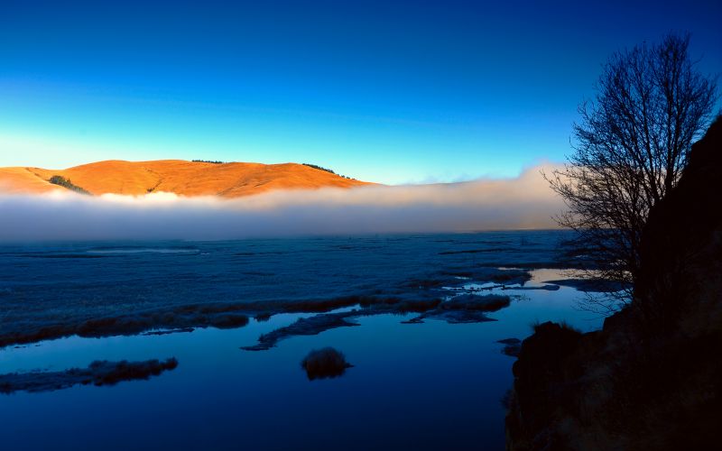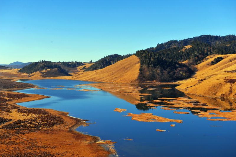 寸冬海子位于木里藏族自治县县城西北部海拔3404米的康坞山顶,距县城45公里,属高原积水湖波。它融山、水、花、木为一体,有“高原明珠”之美誉,湖波面积5000多亩,呈南北走向,南北长约2000米,东西宽300米。胡泊四面环山,山上森林茂密,古木参天,杜鹃花开满漫山遍野;湖水清澈见底,湖面波光粼粼,山怀抱着水,湖水倒映着山峰,形成了山中有水,水中有山的奇特景观。